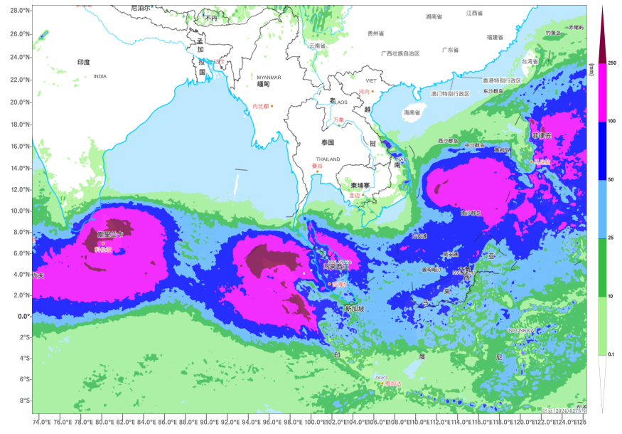 On the morning of November 24, a tropical depression was located near the eastern coast of Mindanao, the Philippines. It is expected that it will move west-northwestward through the central part of the Philippine Islands. It may intensify into Typhoon No. 27 of this year within the next 24 hours, with the maximum intensity reaching that of a strong tropical storm (Figure 1). Over the next three days, the Philippines will experience heavy to torrential rain, with localized extremely heavy downpours (Figure 2), accompanied by strong winds of 6-7 levels, with gusts reaching 8-9 levels (Figure 3). Additionally, influenced by the tropical low-pressure system, regions including the Malay Peninsula, Sumatra, Sri Lanka, and southeastern India will continue to face heavy to torrential rain, with localized extremely heavy downpours. Most areas will accumulate rainfall of 100-160 mm, with some regions reaching 200-250 mm, and the maximum could exceed 400 mm (Figure 4). Attention should be given to the adverse impacts of the severe weather on local power facilities, transportation, and other sectors, as well as the prevention of secondary disasters such as flooding, landslides, and mudslides that may be triggered by the heavy rainfall.